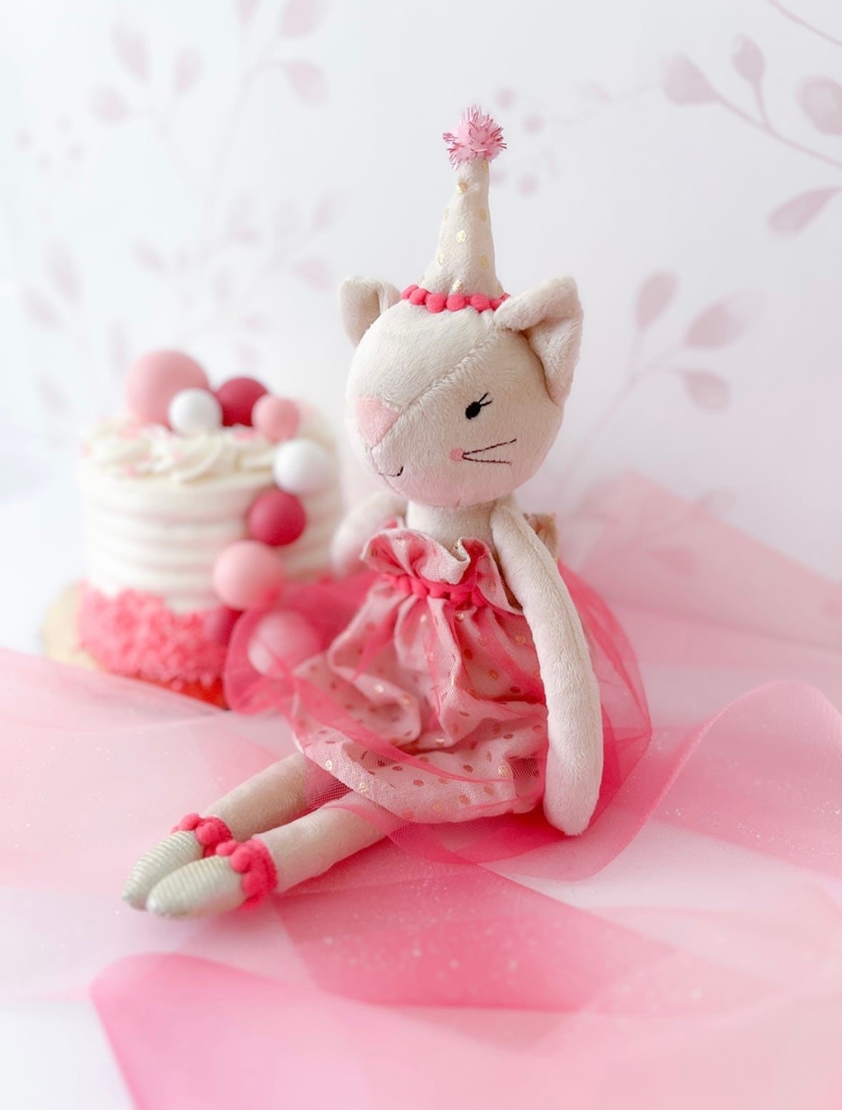 キラキラ輝くピンクのパーティードレスと、おそろいのポンポンが付いたパーティーハットを身にまとった子猫のピア。