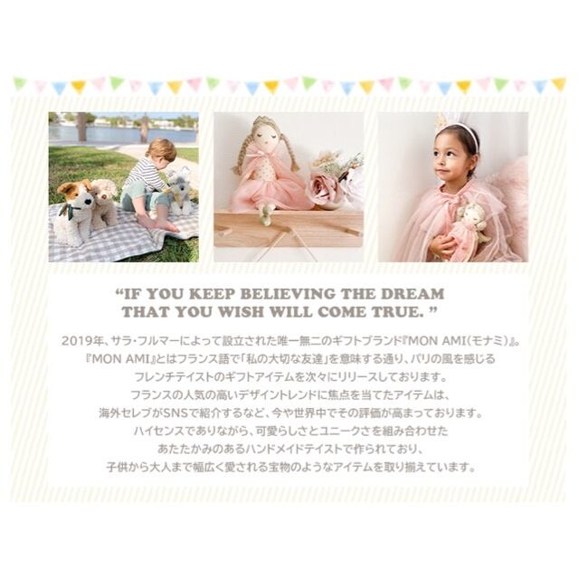 フランス語で“私の友人”を意味する『MON AMI』は、パリの風を感じる上品で美しいぬいぐるみやデコレーションを取り揃えています。