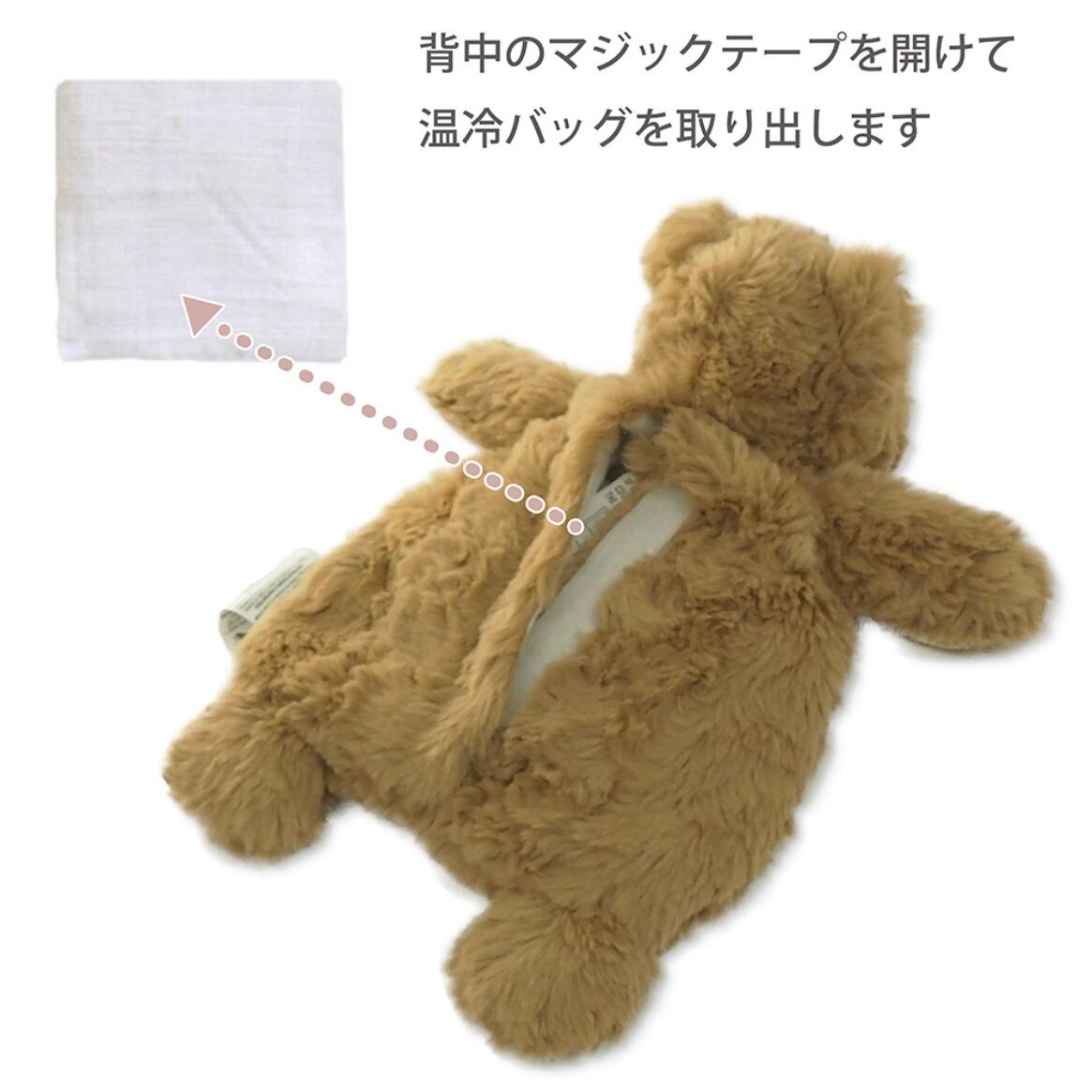 ぬいぐるみの背中のマジックテープを開けて温冷バッグを取り出し、電子レンジで20秒温める、または 冷凍庫で冷やして内部に戻せば暖かさや涼しさを楽しめます。