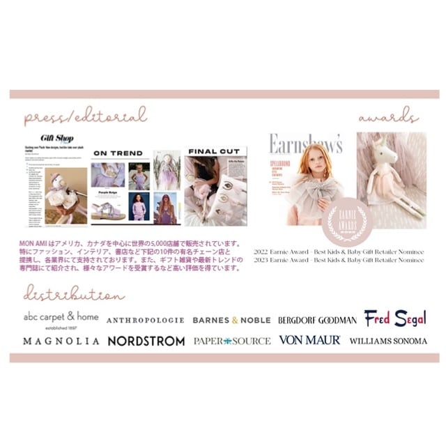 フランス語で“私の友人”を意味する『MON AMI』は、パリの風を感じる上品で美しいぬいぐるみやデコレーションを取り揃えています。